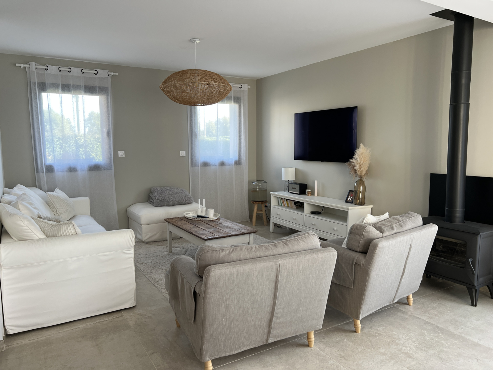 Un grand hall d'entrée, une pièce de vie de 50m² avec cuisine équipée et poêle à bois, une suite parentale, un cellier