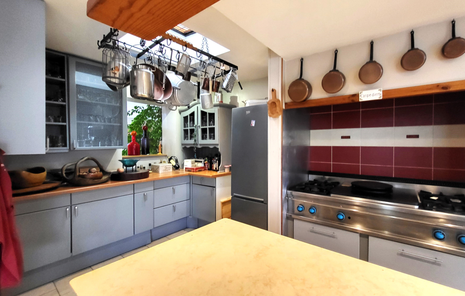 - vaste séjour traversant (52 m²) incluant l'espace cuisine aménagée et équipée "semi-pro", le tout ouvrant sur la terrasse, le jardin et la piscine dotée d'une couverture télescopique,