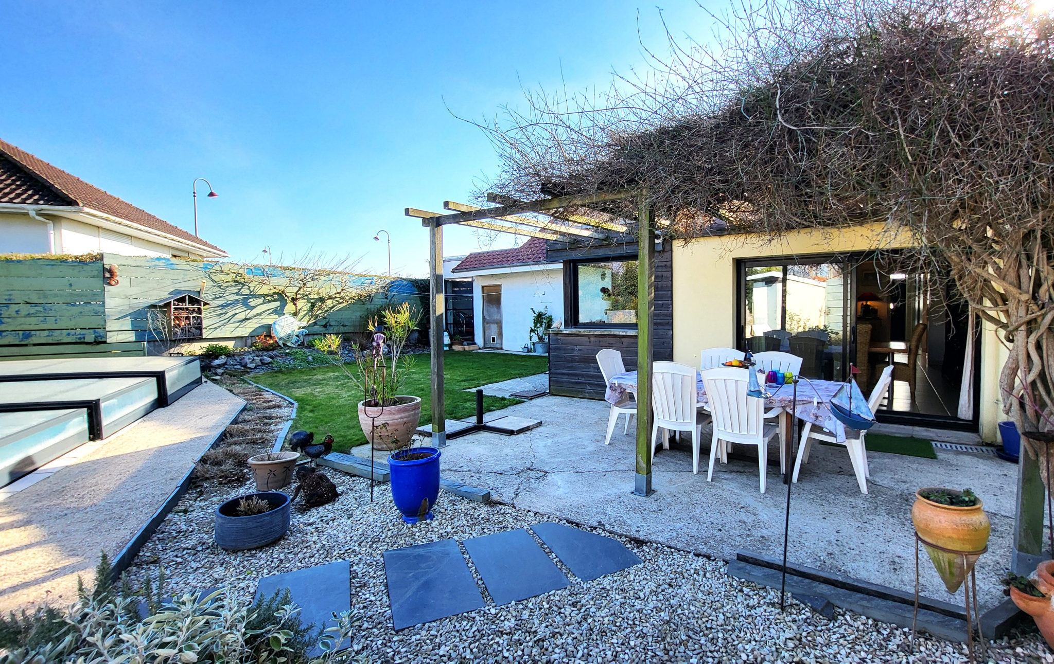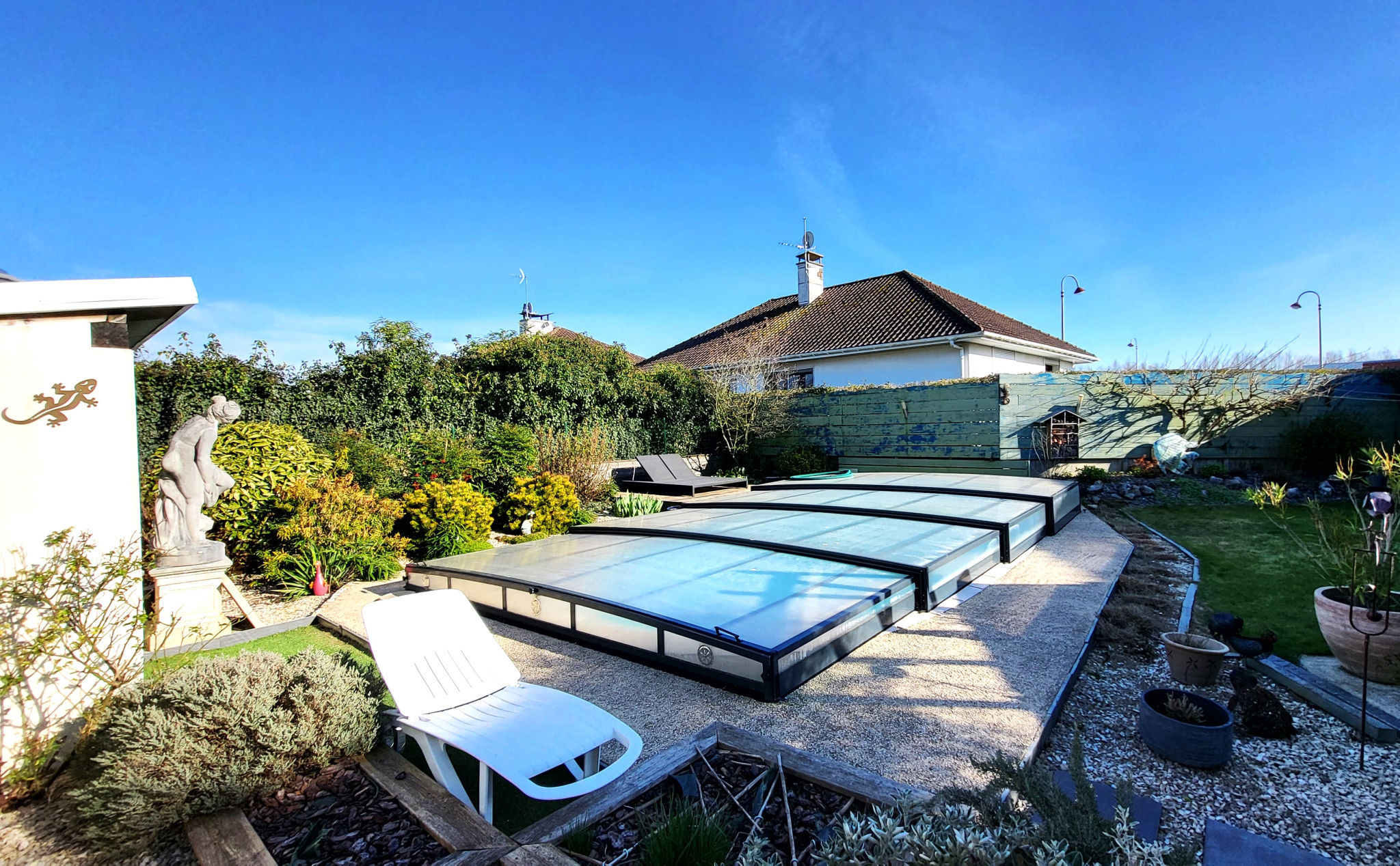 Jardin clos avec piscine de 28 m² (7x4) et 45 m3 (profondeur 1,60 m fond plat), équipée balnéothérapie et nage à contre-courant, revêtement gel-coat, filtration éco verre filtrant.