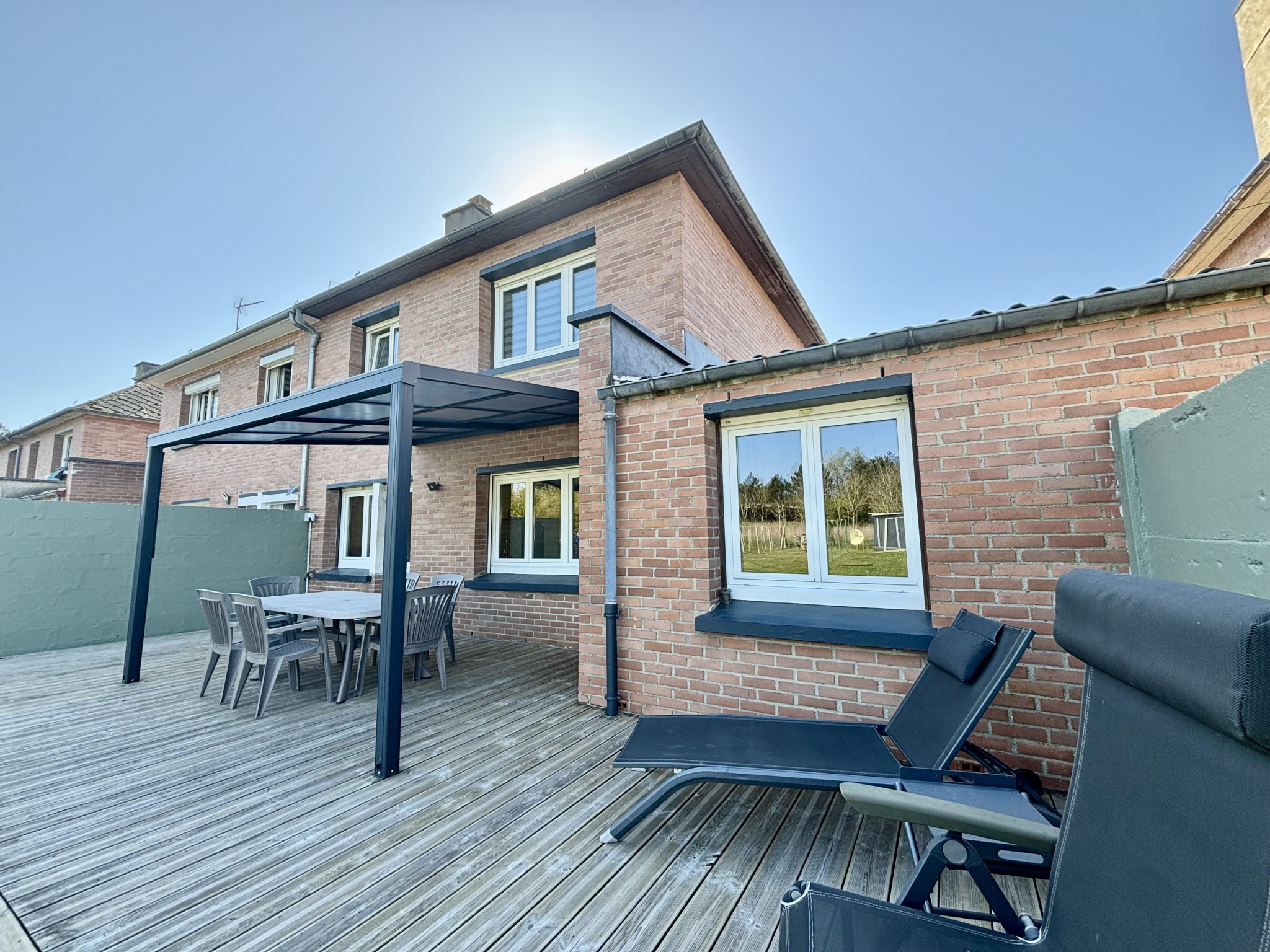 Belle terrasse en bois avec pergola sans vis-à-vis donnant sur un terrain de 504 m² entiérement clos.