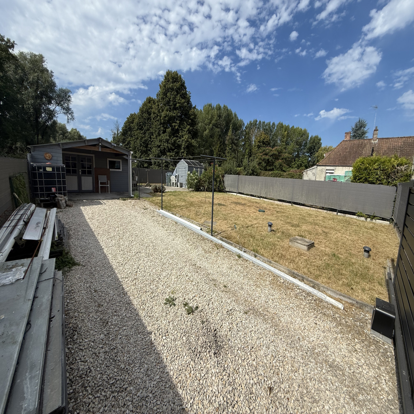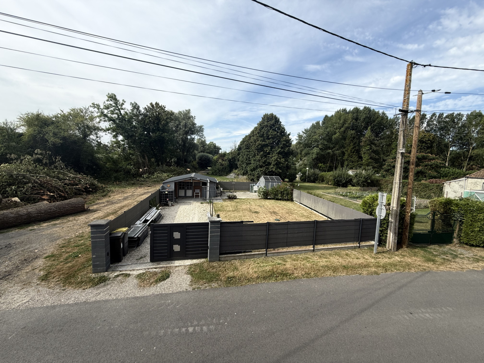 Jardin indépendant avec portail électrique et grand chalet.