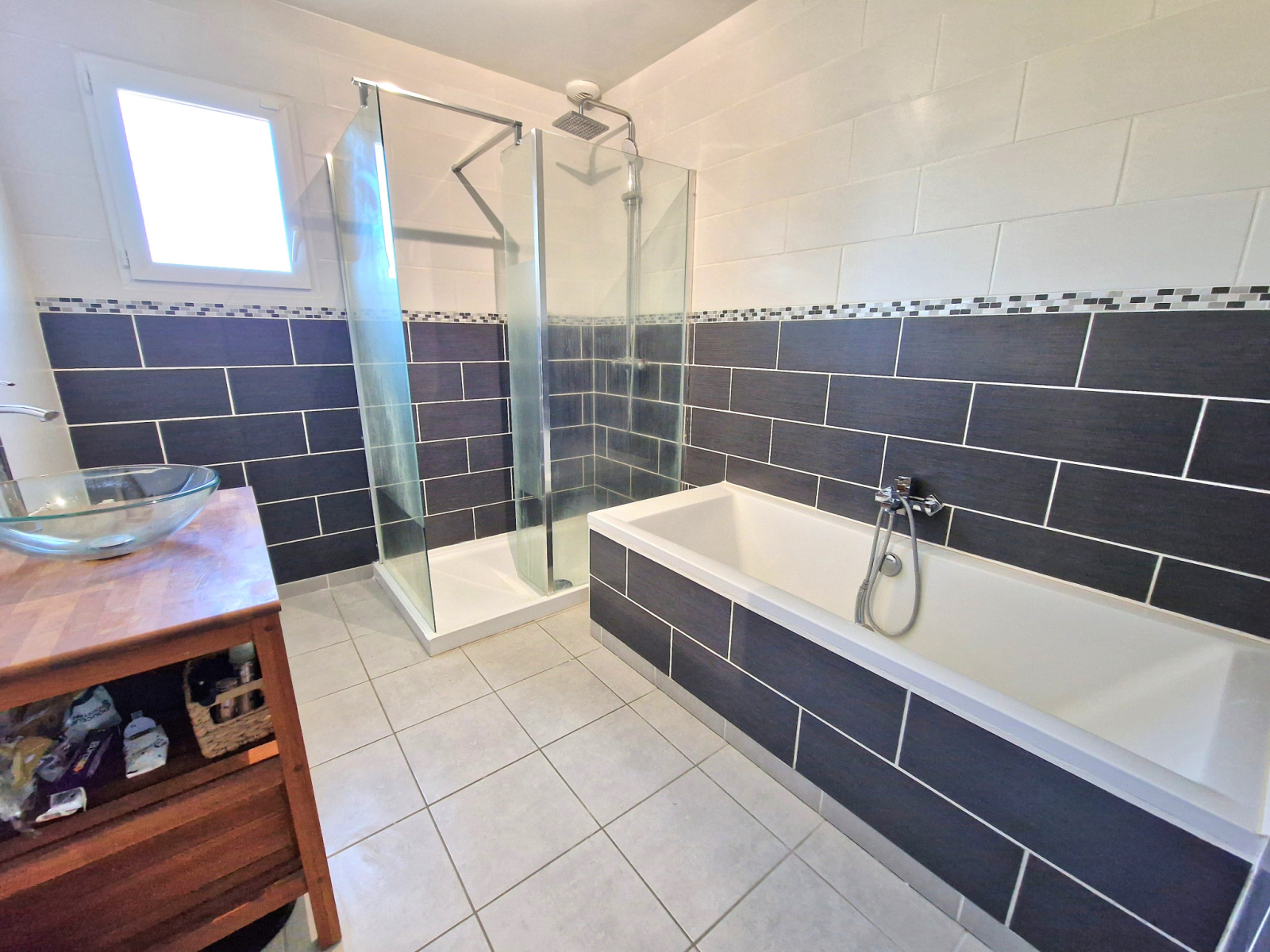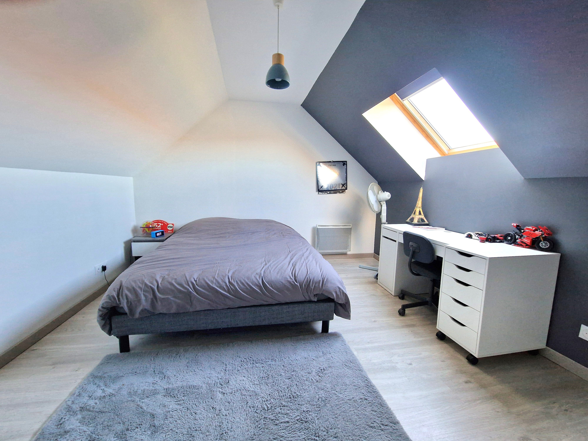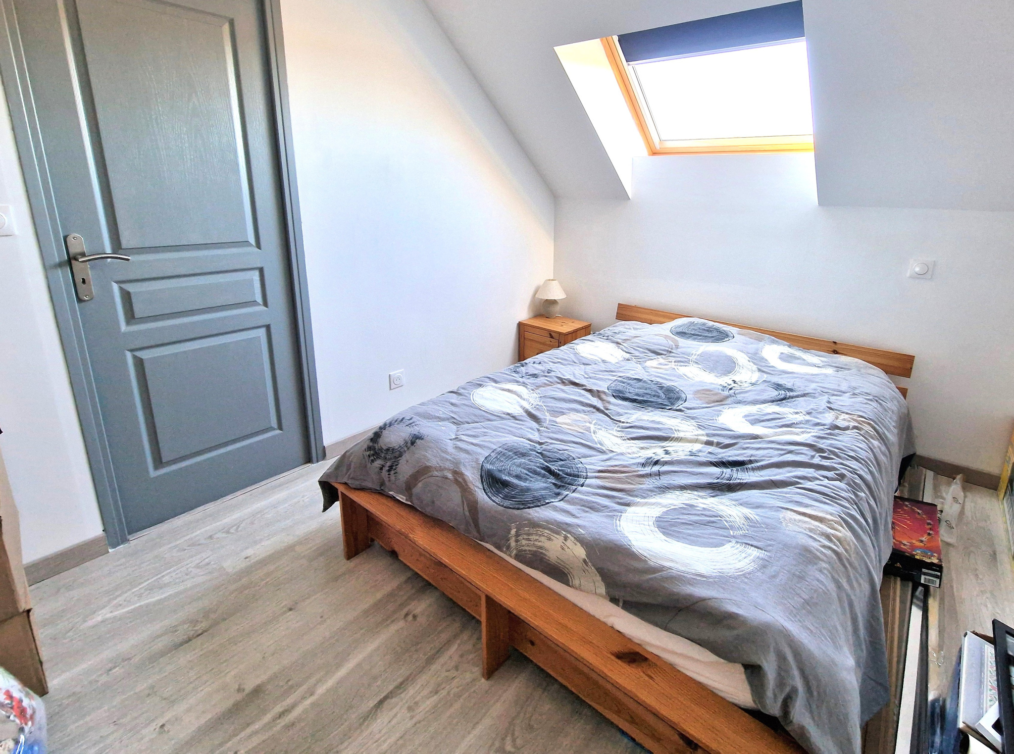À l’étage, un grand palier distribue une pièce de débarras, une chambre, une salle d’eau avec vasque, douche et WC, ainsi qu’une pièce à usage de bureau ou de chambre d’appoint.