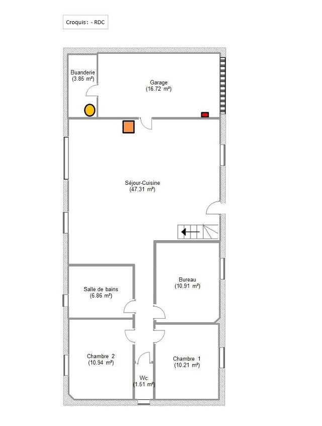 Sur le plan technique, les menuiseries sont en PVC double vitrage, équipées de volets roulants manuels, avec motorisation pour la baie vitrée. Le chauffage est assuré par un poêle à granulés complété par des radiateurs électriques. La production d’eau chaude est assurée par un cumulus électrique. L’assainissement est individuel, de type fosse toutes eaux avec épandage, en conformité.