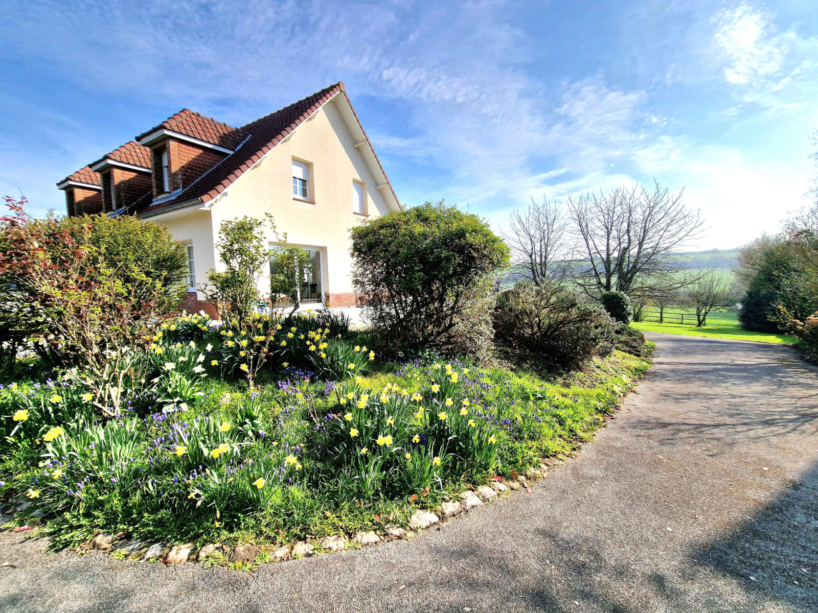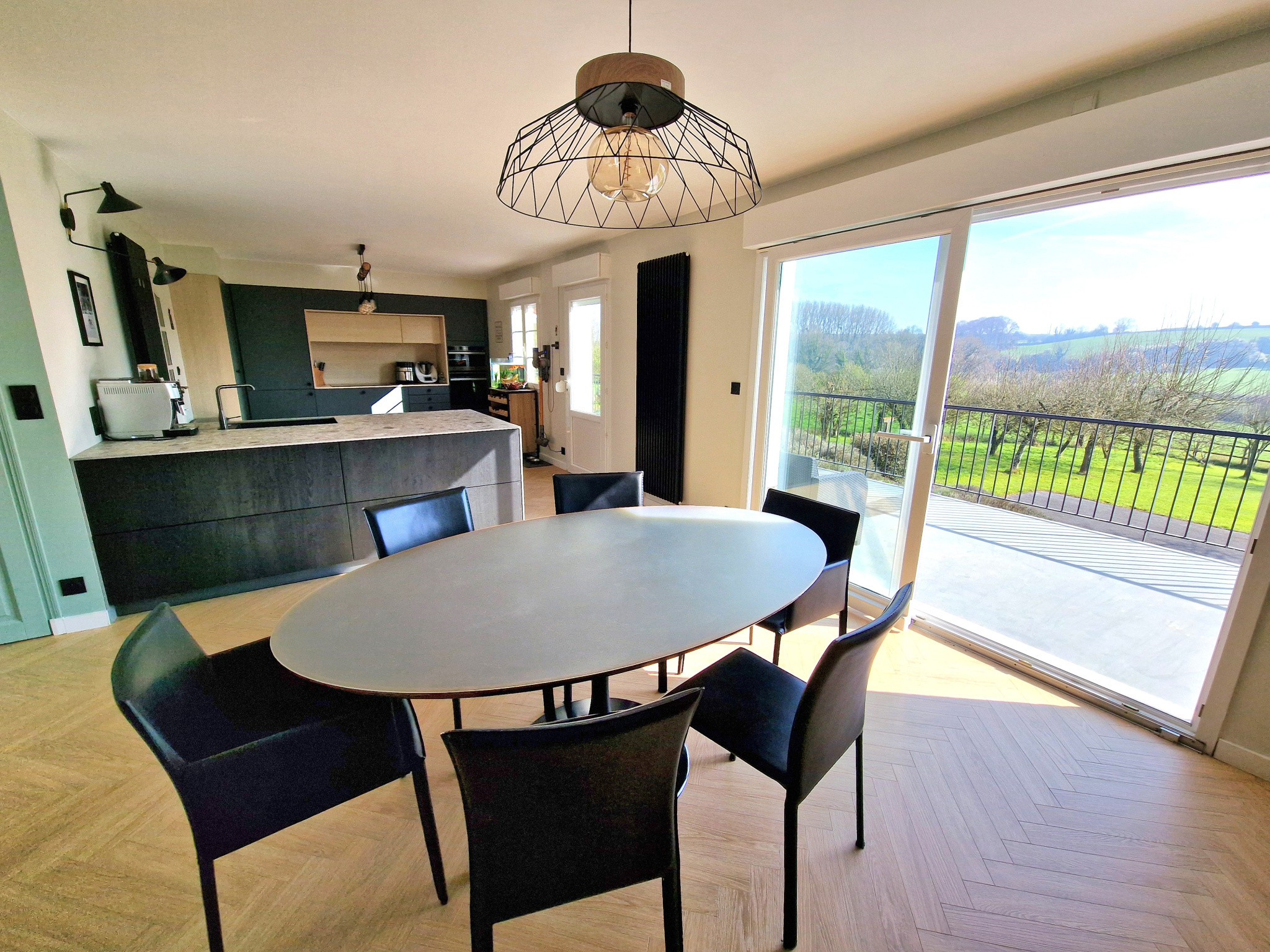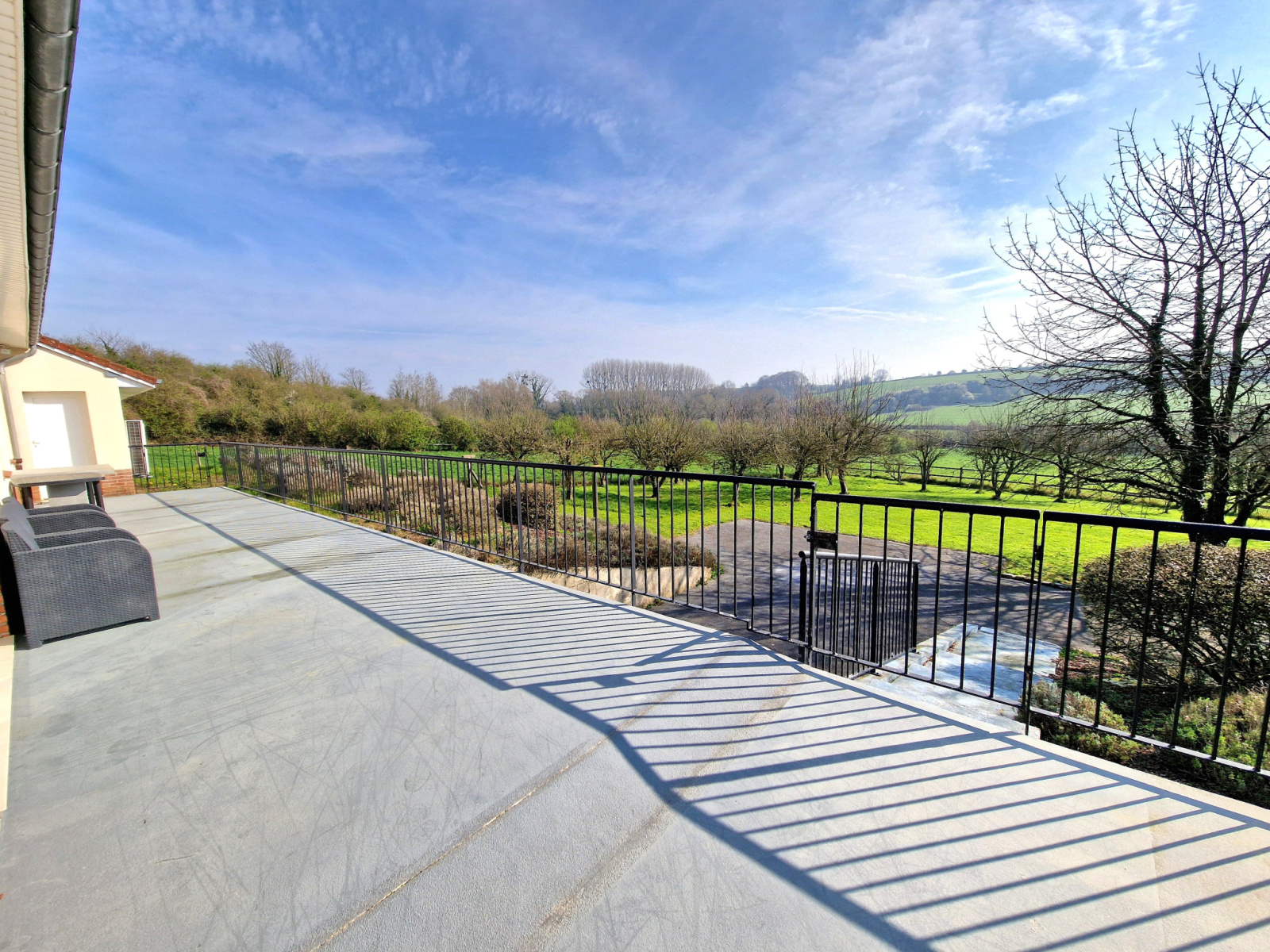 De larges baies offrent un accès direct à deux spacieuses terrasses orientées Est et Sud, avec une vue dégagée sur le jardin, la pâture et les collines environnantes.