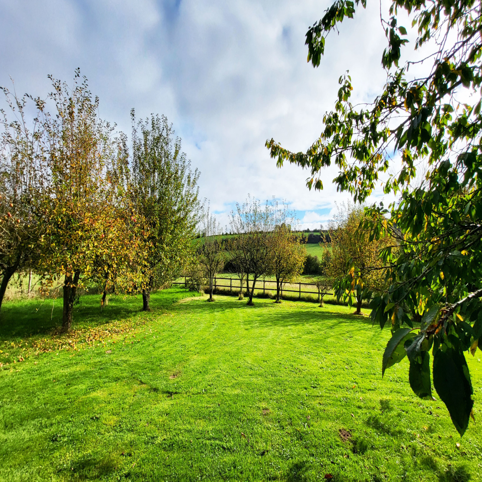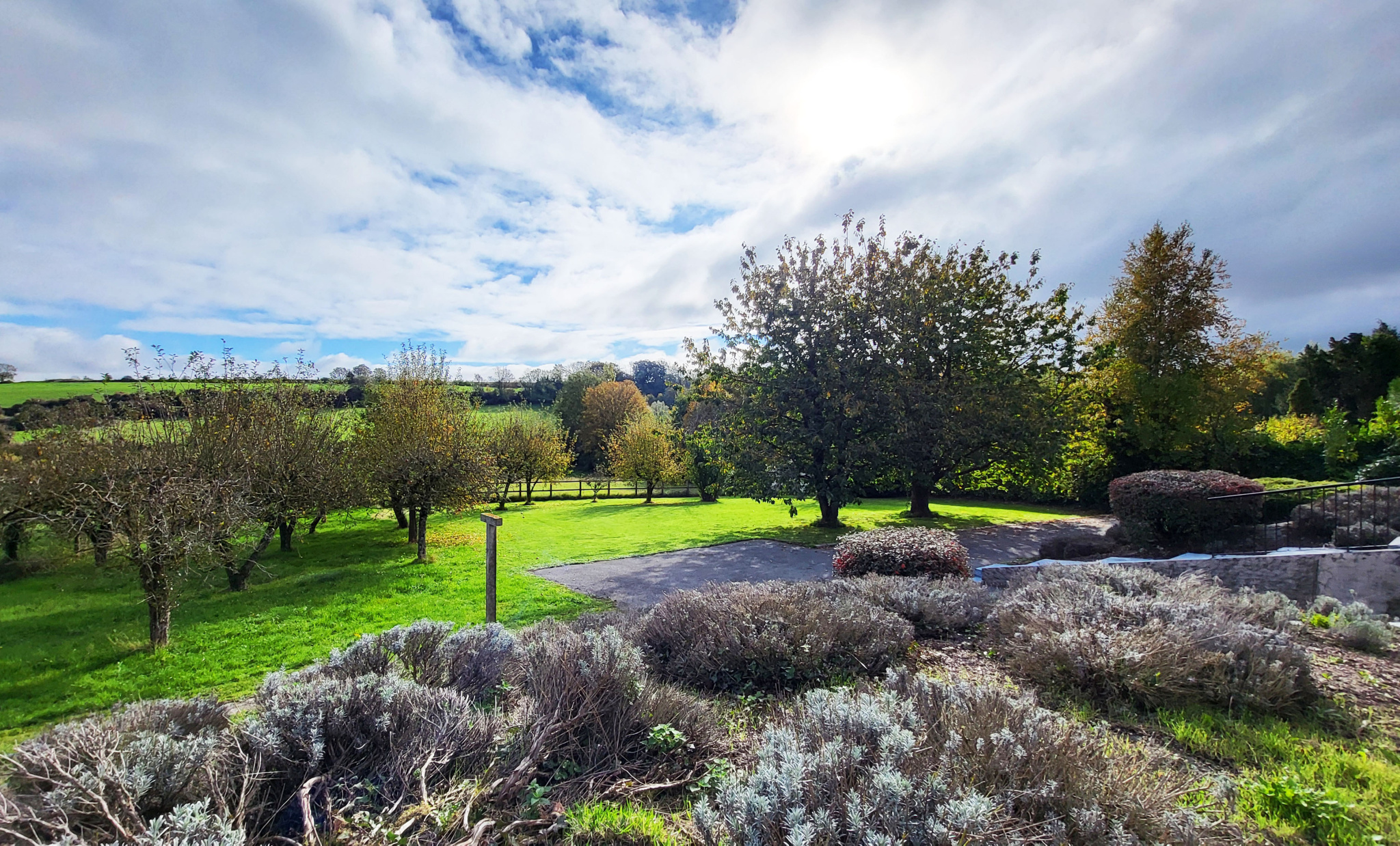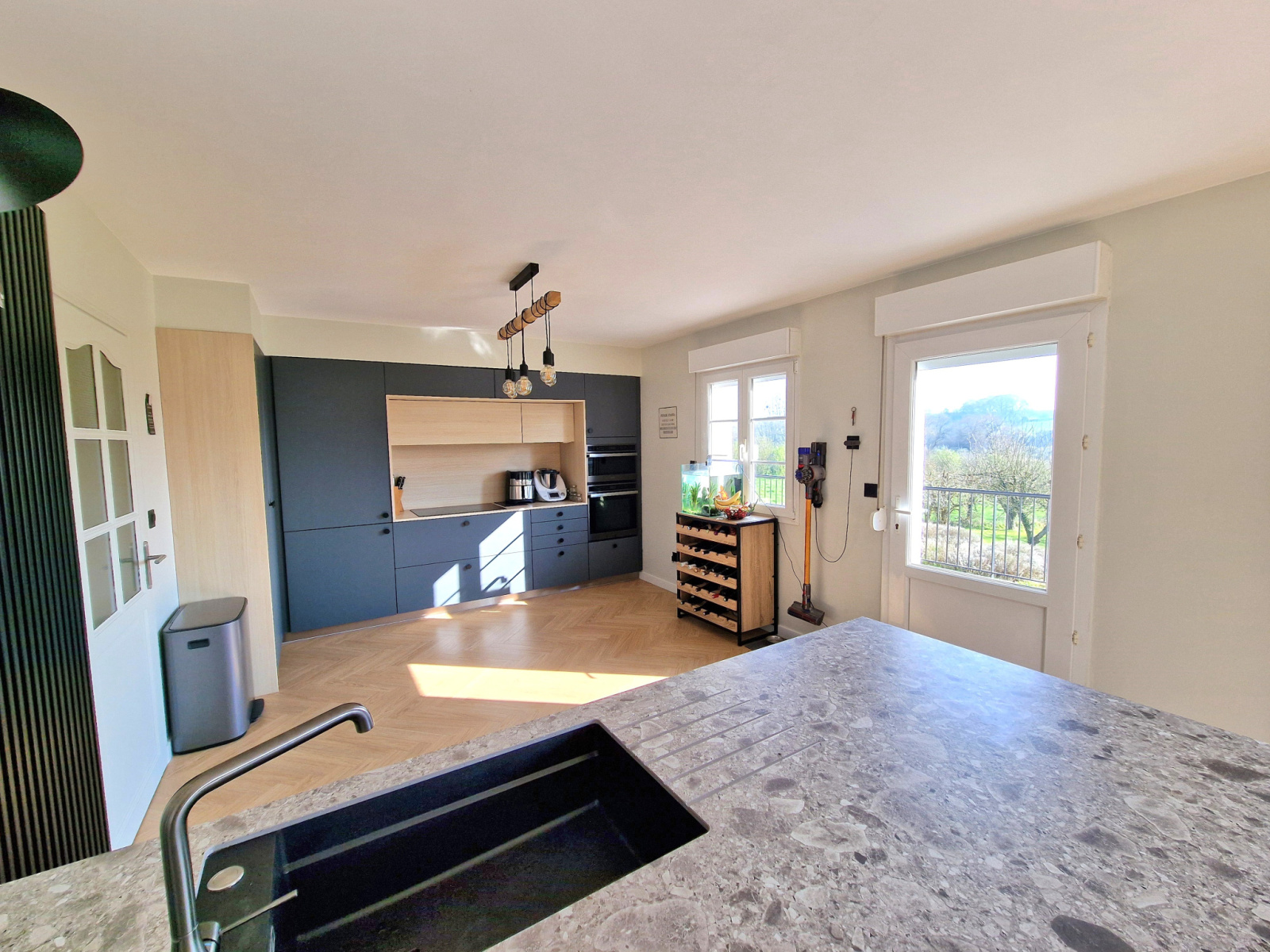 De larges baies offrent un accès direct à deux spacieuses terrasses orientées Est et Sud, avec une vue dégagée sur le jardin, la pâture et les collines environnantes.