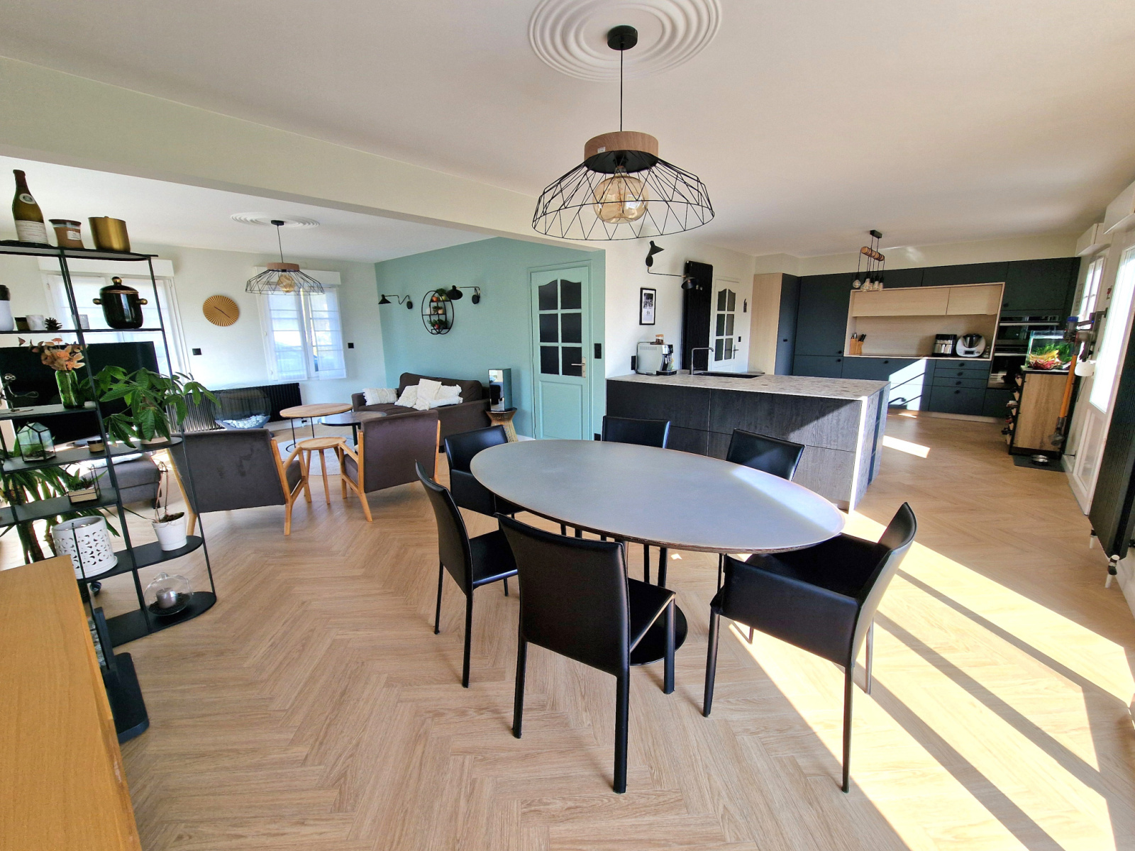 L'entrée, avec placards, dessert un bel espace de vie de 55 m², traversant et baigné de lumière grâce à sa triple exposition. La cuisine ouverte, entièrement aménagée et équipée, a été refaite en 2022.