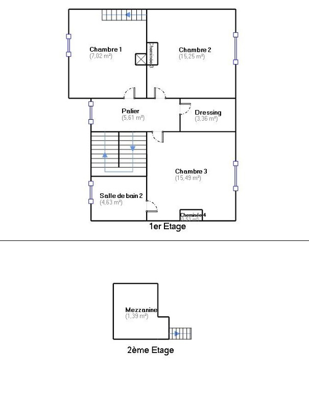 A l'étage (sur plancher d'origine) un palier distribuant: Deux chambres dont une en duplex, une suite parentale avec la chambre de 15.50 m² avec sa salle de bains privative de 5 m² (baignoire + double vasque + WC) ainsi qu'une pièce de dressing.