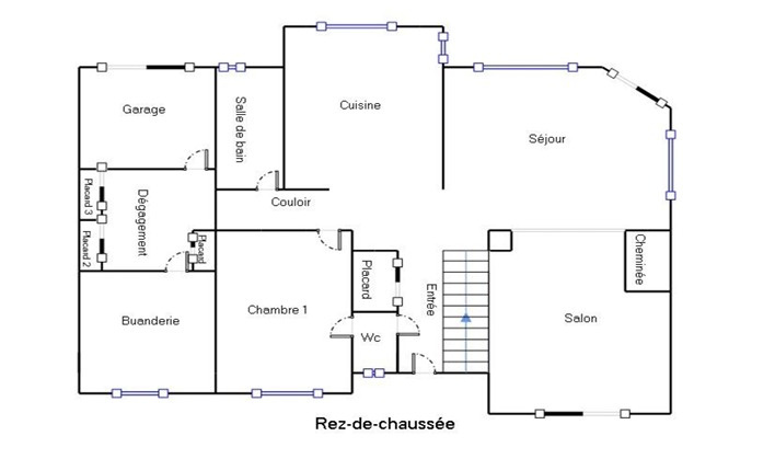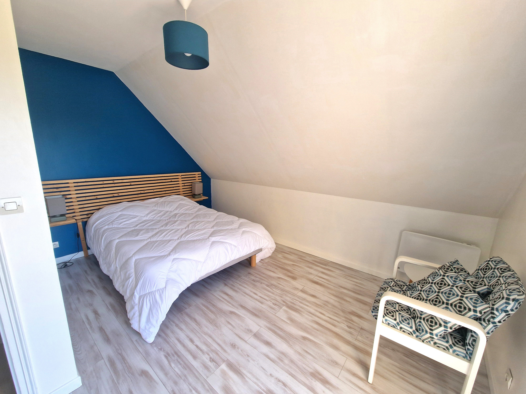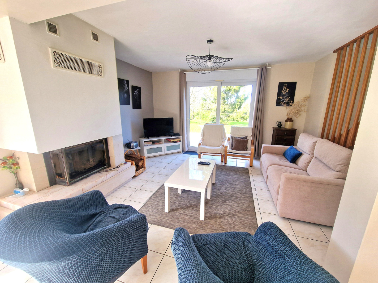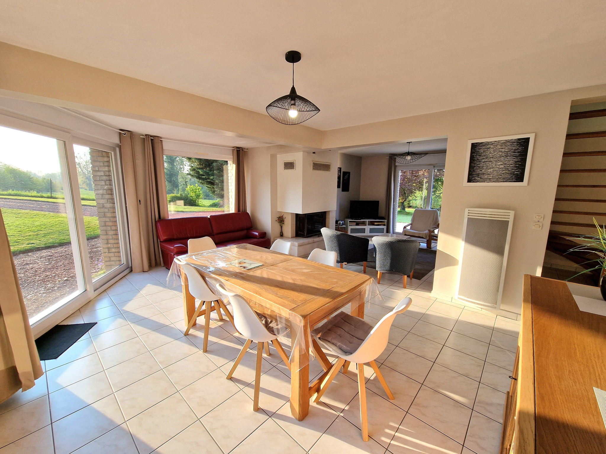 Les menuiseries sont en PVC double vitrage avec volets roulants manuels et électriques. Le chauffage est assuré par des radiateurs électriques complétés par un insert à bois tubé et la production d’eau chaude est réalisée par un cumulus électrique.