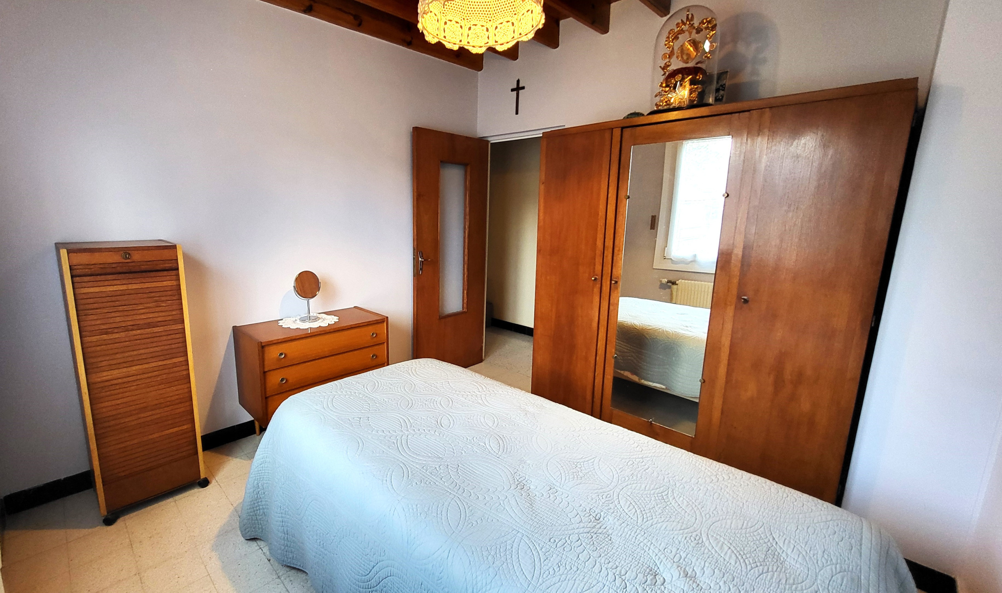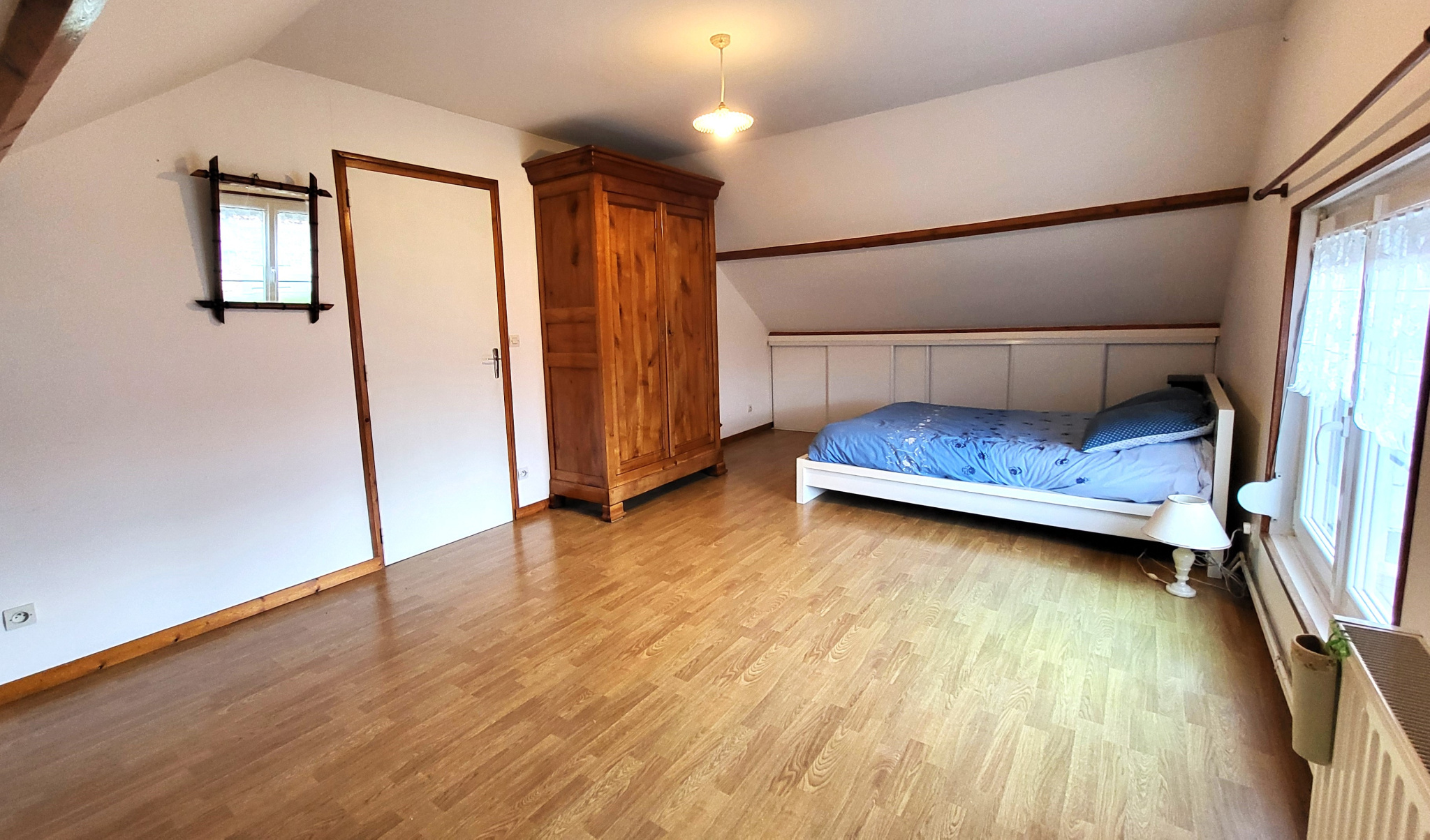 A l'étage, une grande chambre sous combles (env.30 m² au plancher / 15.85 m² habitables), et grenier aménageable ( 51 m² au plancher, carton bitumé sur rampants, isolation au plancher).