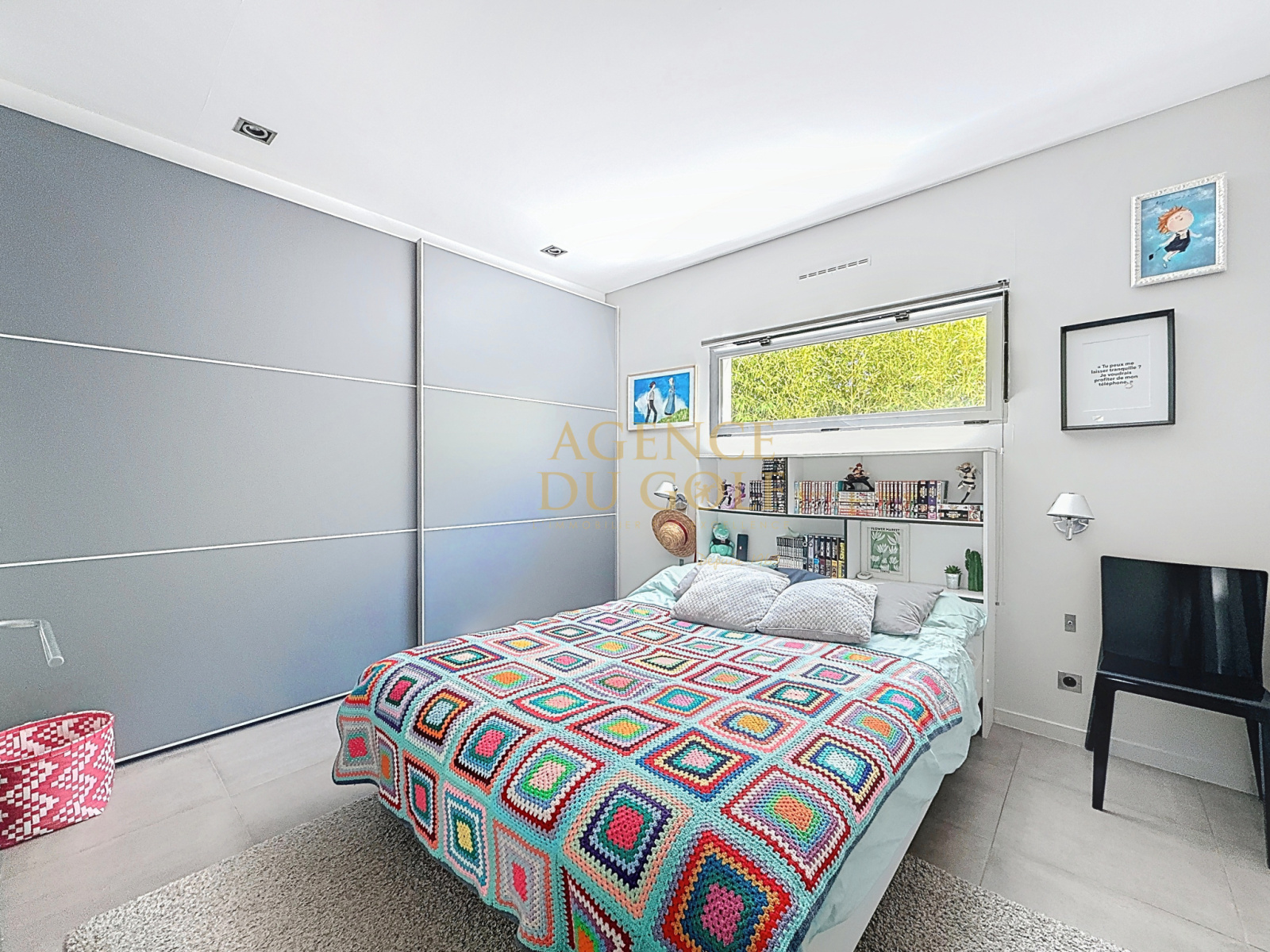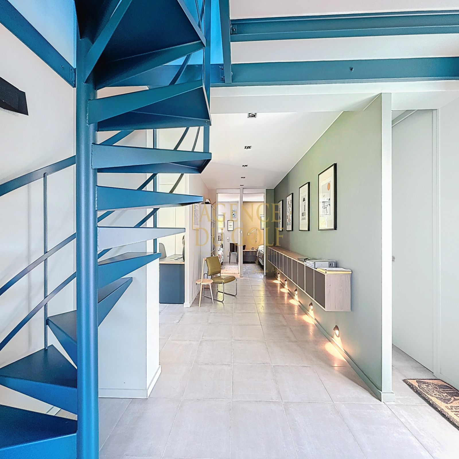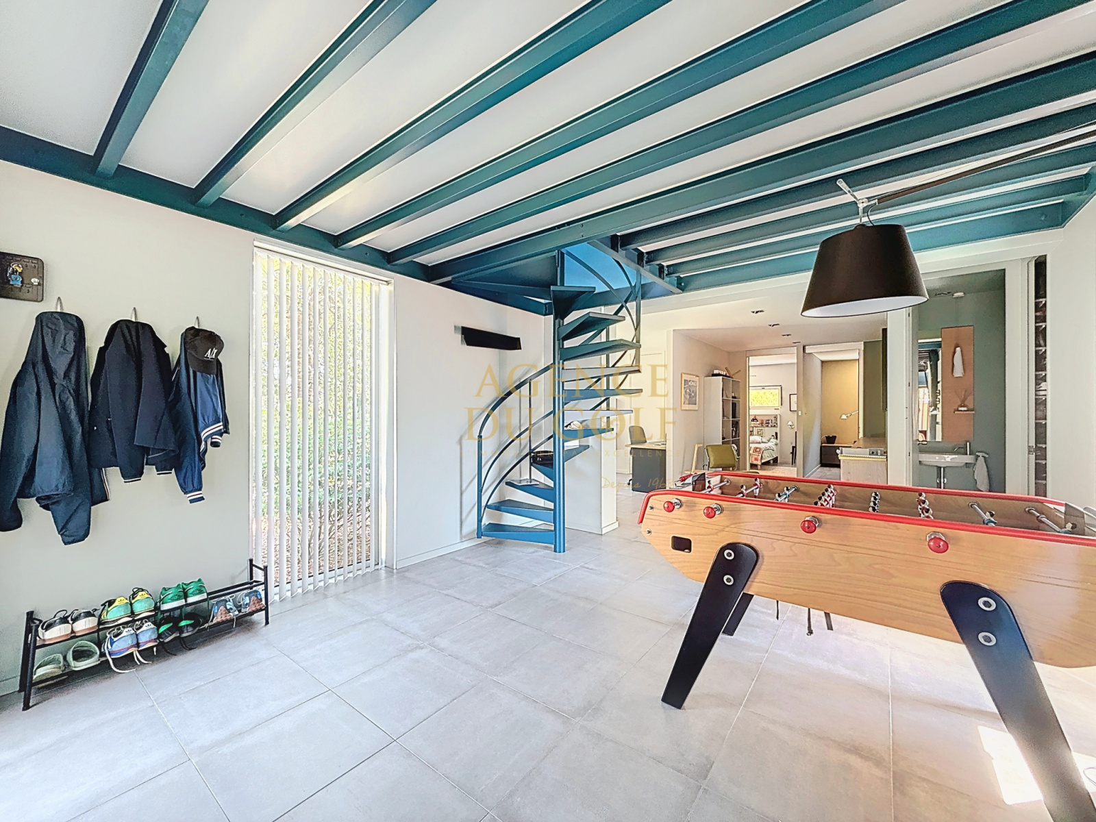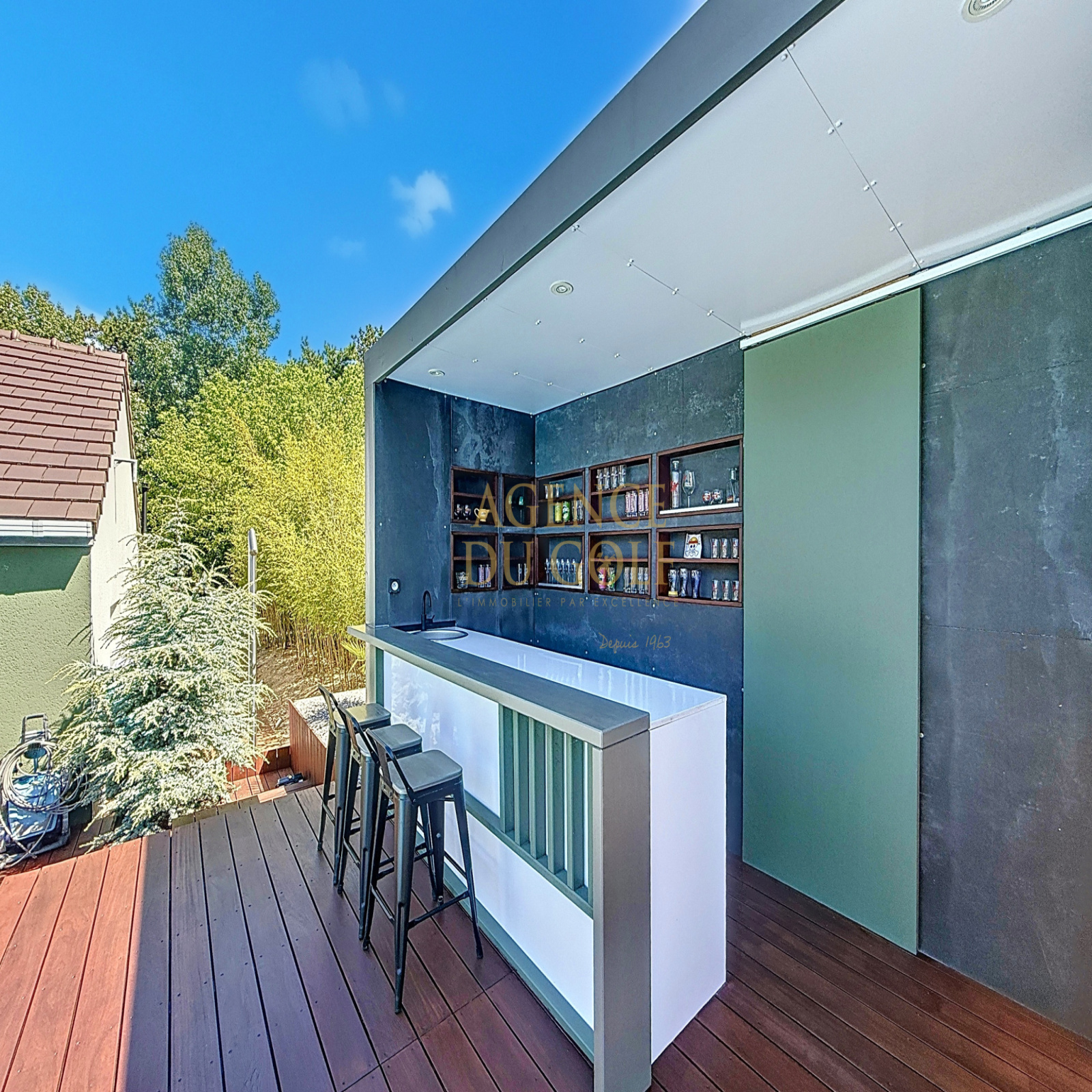 Un art de vivre contemporain, Dès l’entrée, la magie opère : une grande pièce de vie baignée de lumière grâce à une triple exposition nord-sud-ouest et à une hauteur cathédrale spectaculaire, donnant une impression d’espace et de légèreté. Le séjour s’ouvre sur un jardin arboré et paysager, offrant à chaque orientation une perspective différente. La cuisine ouverte en noyer américain, réalisée sur mesure, est un chef-d’œuvre de design et de fonctionnalité : électroménager haut de gamme Miele, rangements dissimulés, intégration parfaite — un espace aussi beau que performant.