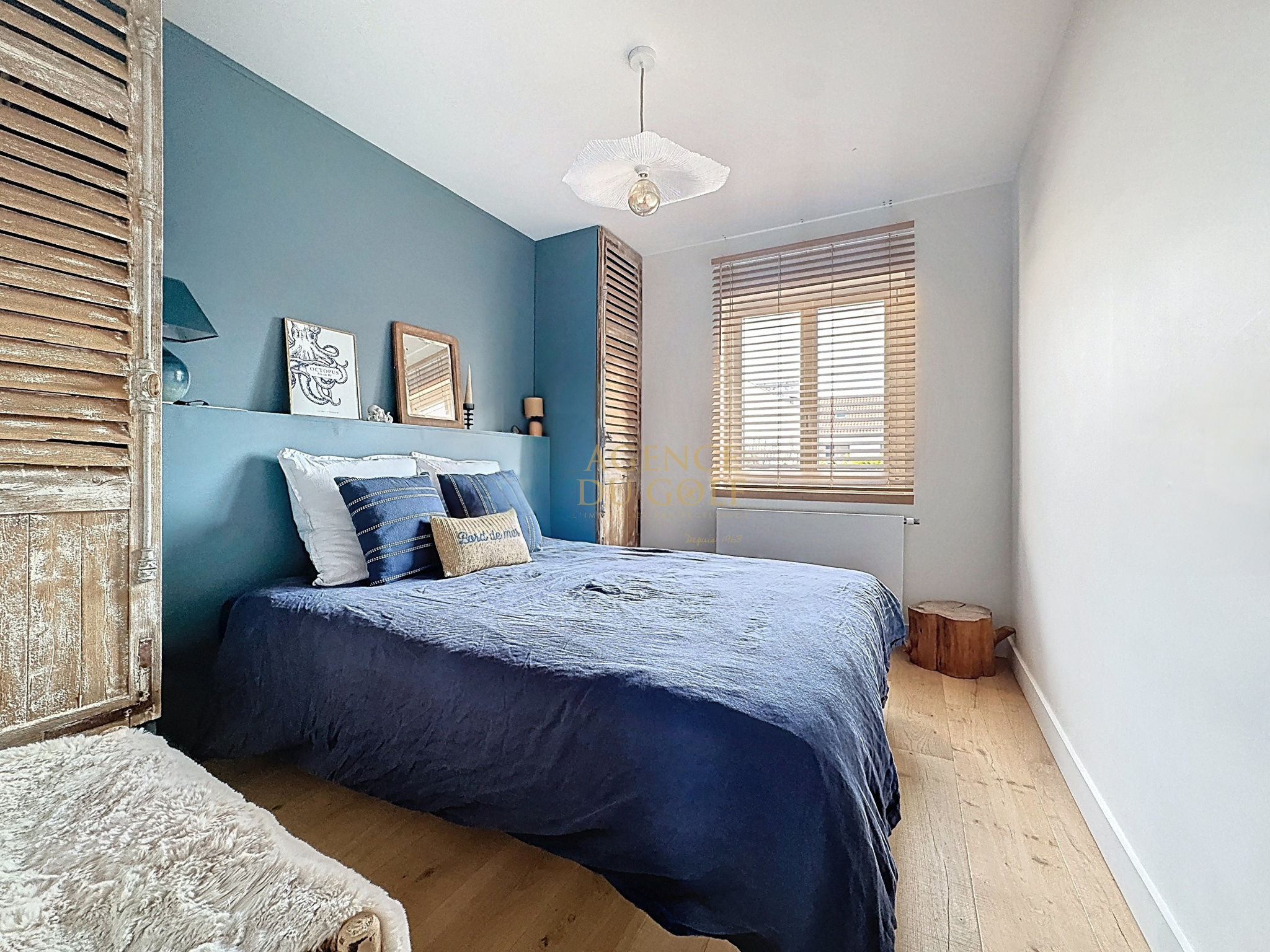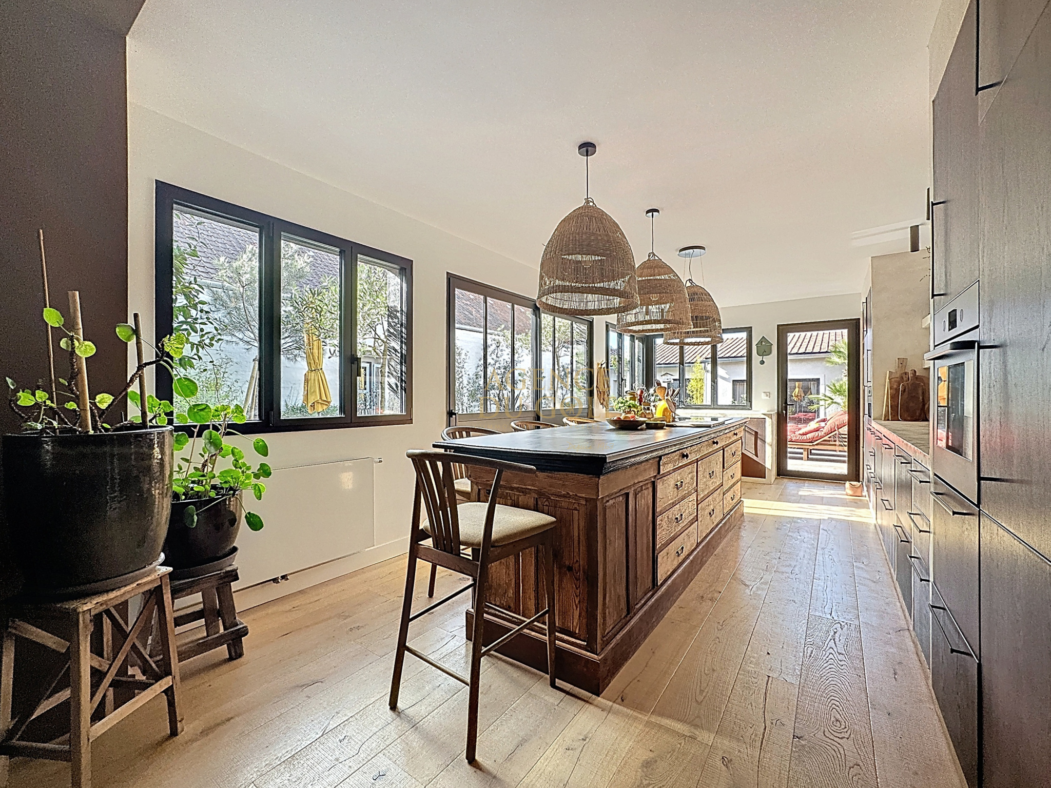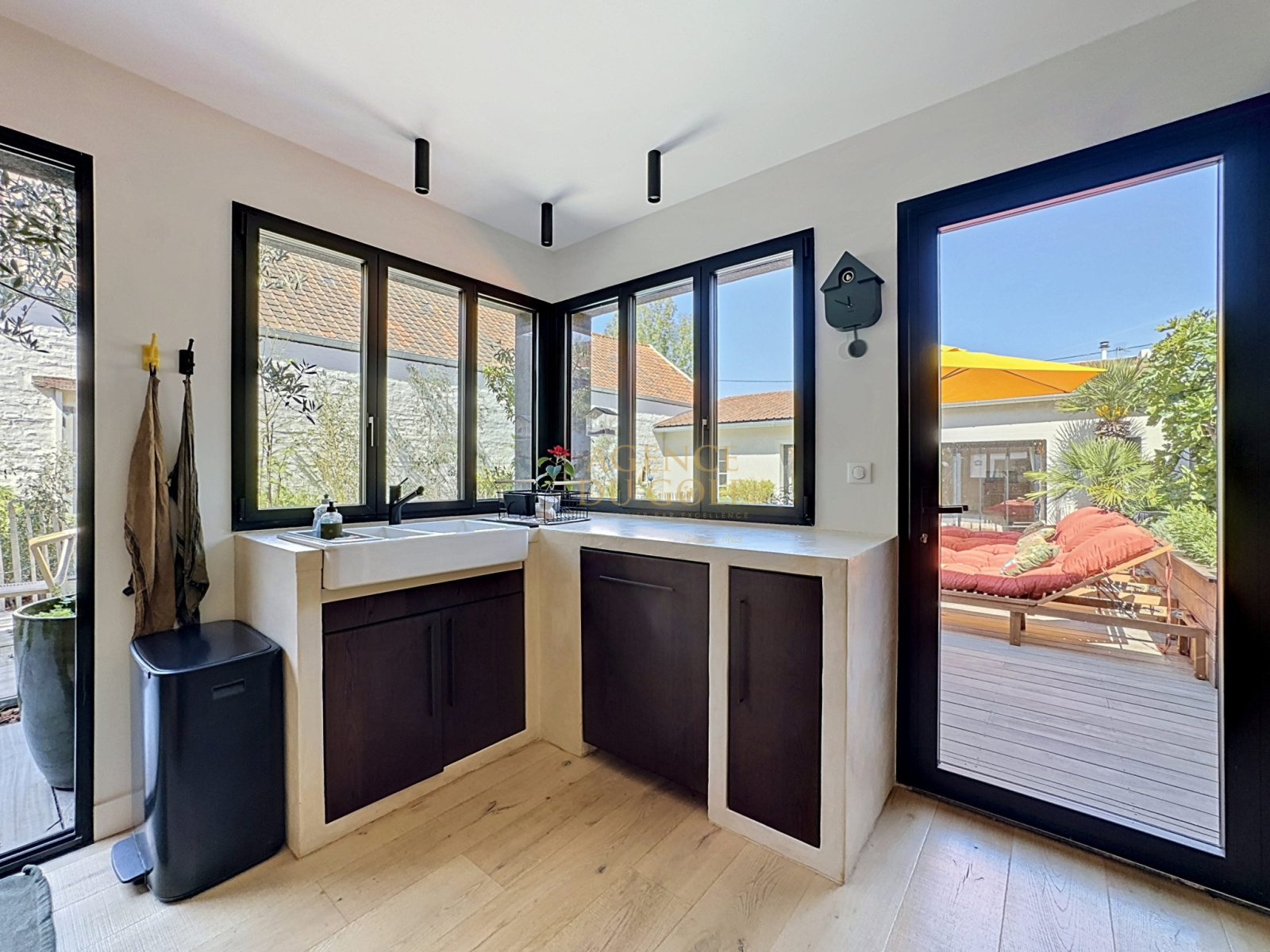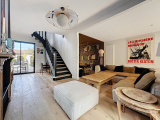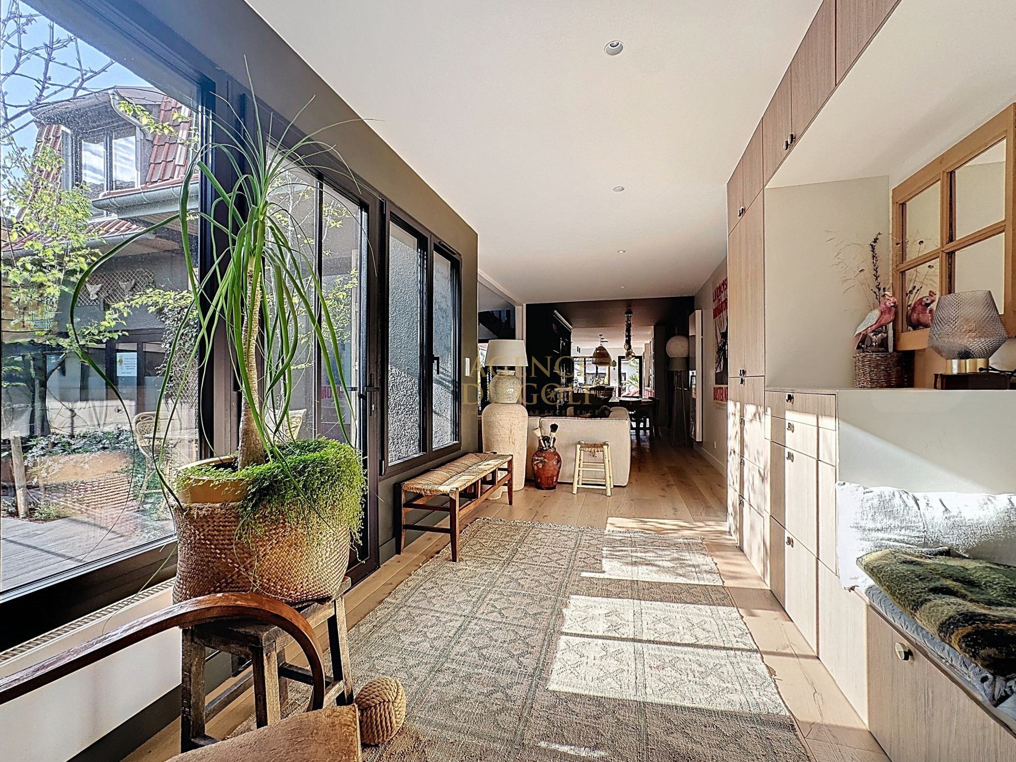 On découvre un portail qui laisse entrevoir une atmopshère particulière, une terrasse fleurie, un abri fermé aux portes d'ailleurs renferment des vélos draisiennes et autres affaires de plages... direction le hall d'entrée et déjà le ton est donné avec cette verrière style atelier, qui dévoile un intérieur de caractère. Côté droit Wc et local technique s'effacent en toute discrétion pour laisser place à la perspective salon séjour cuisine ....