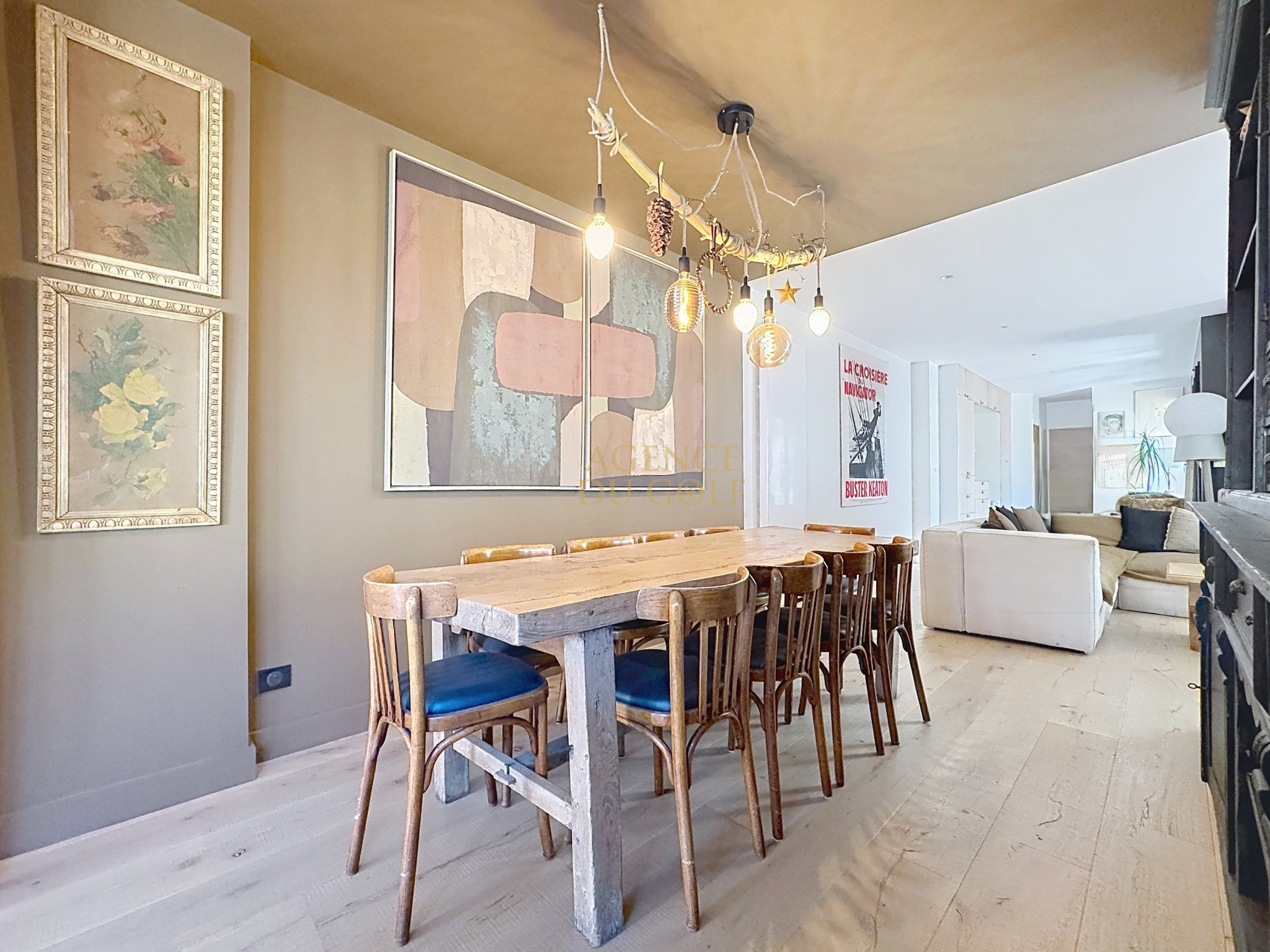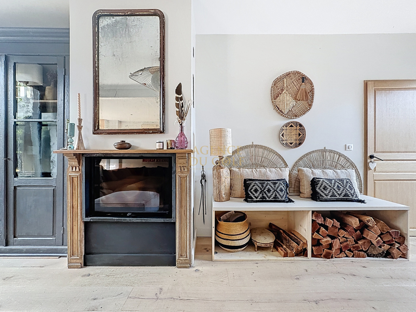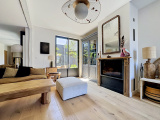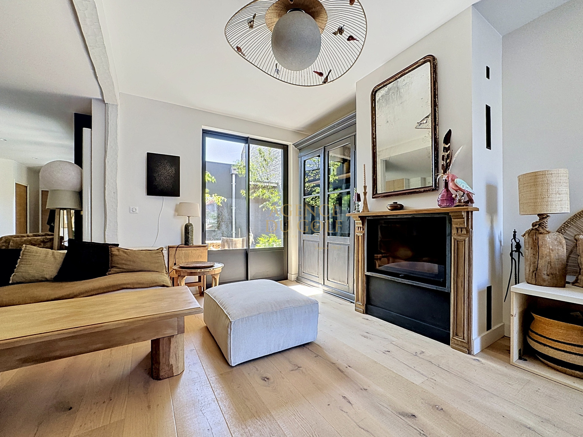 Le séjour, chaleureux et raffiné, s’articule autour d’une cheminée insert, promesse de moments partagés en toute saison.
