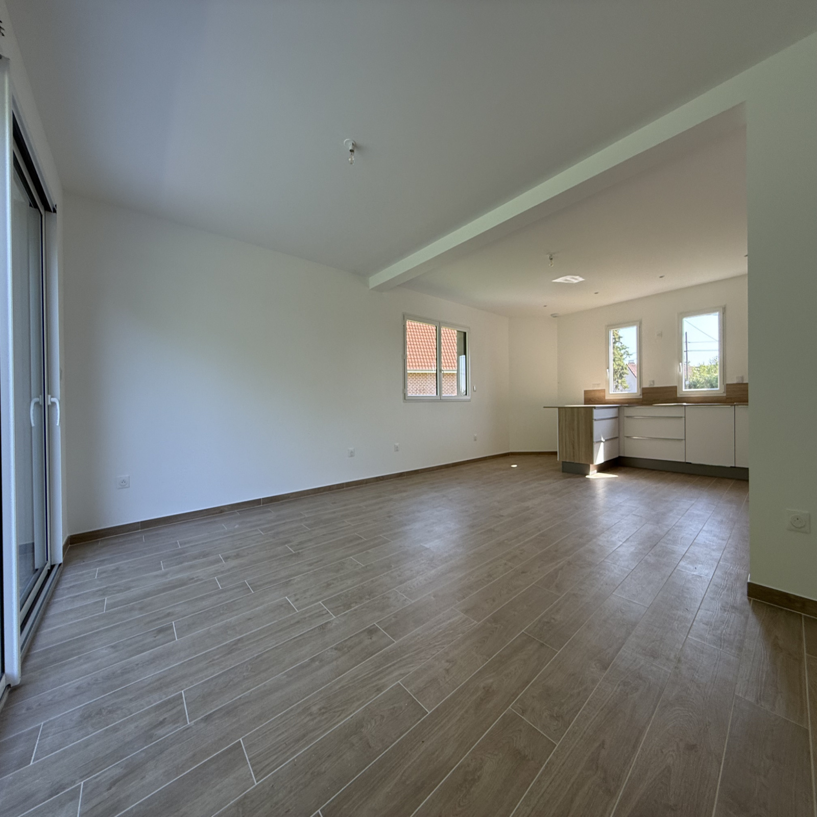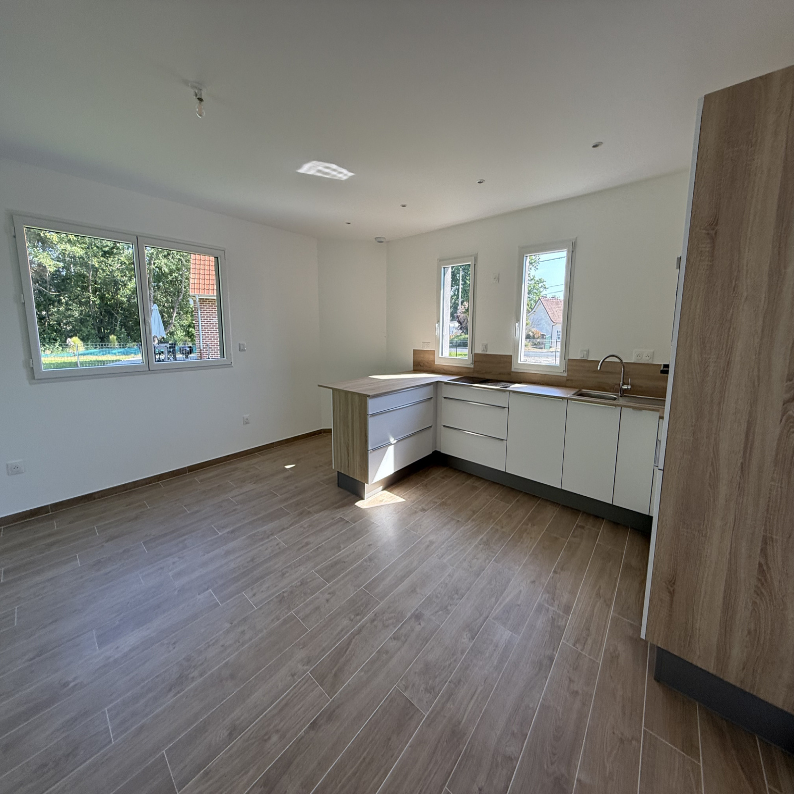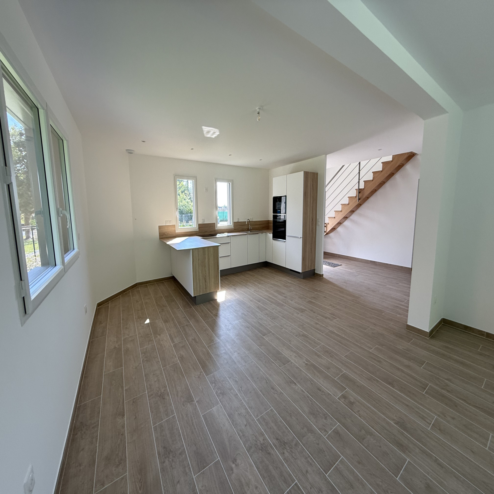 Grand séjour lumineux avec cuisine et électroménager haut de gamme en cours d'installation.