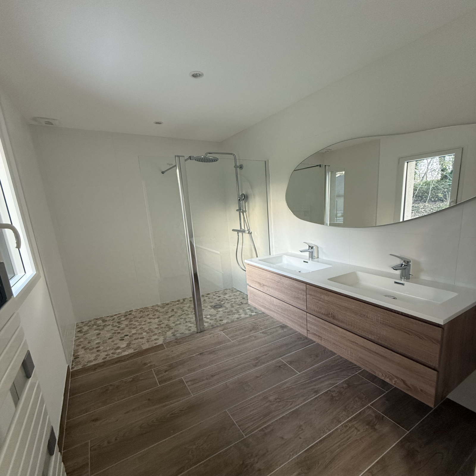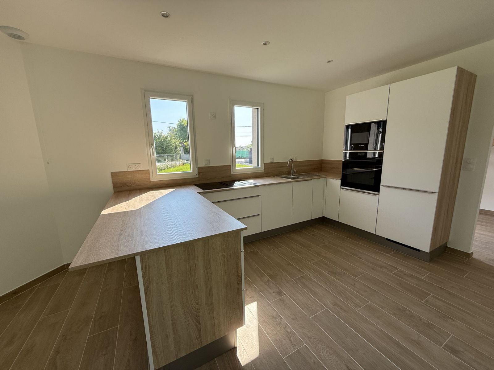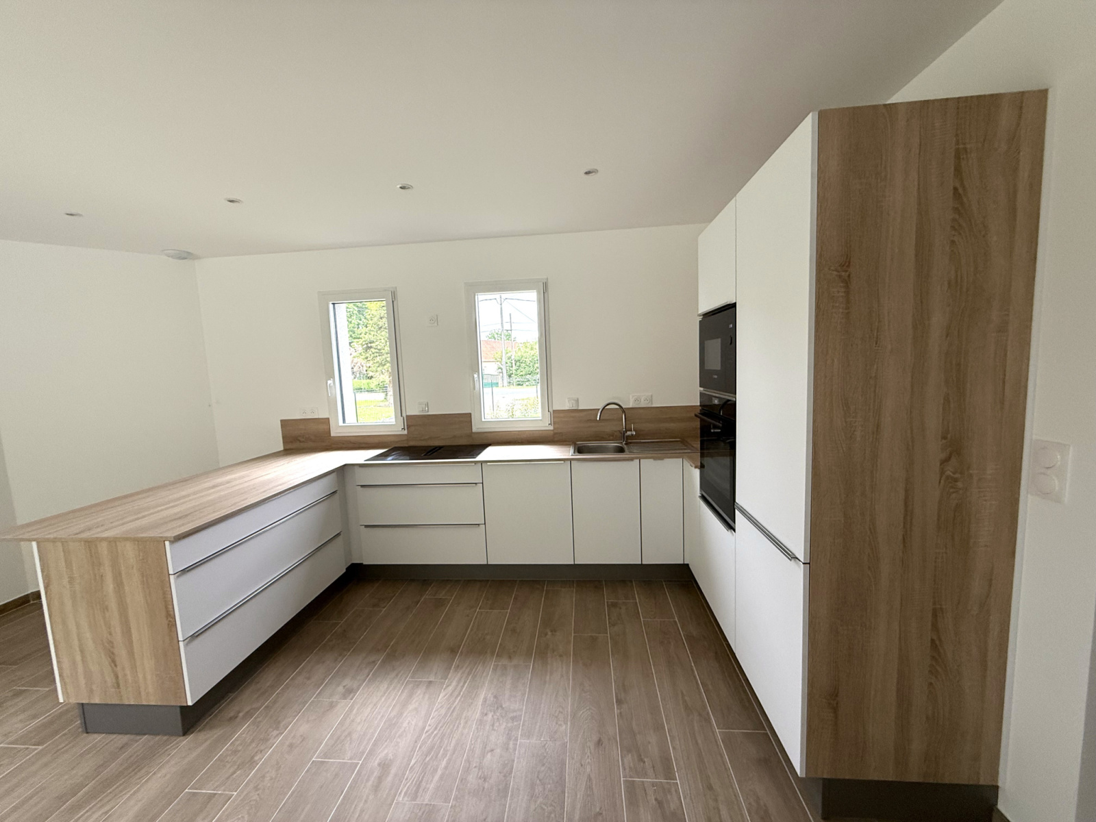 Grand séjour lumineux avec cuisine et électroménager haut de gamme en cours d'installation.