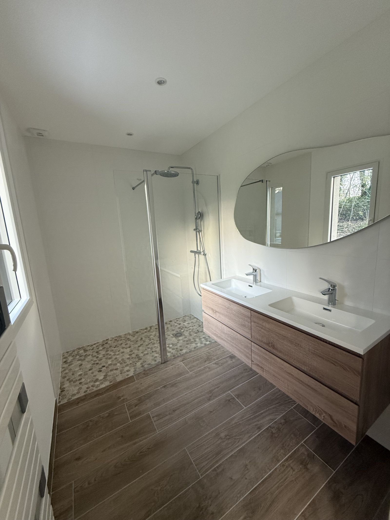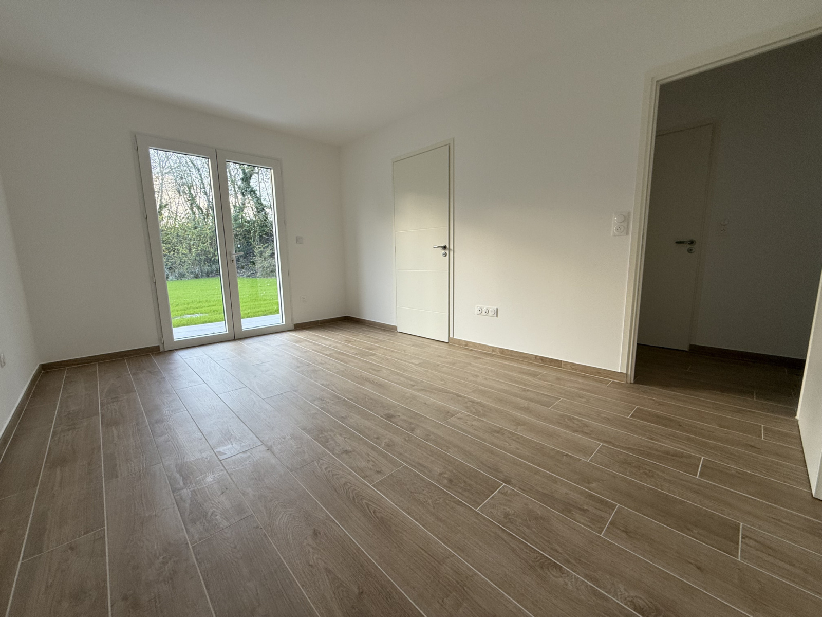 Espace parental en rez-de-chaussée avec chambre, salle de douches et accès terrasse.