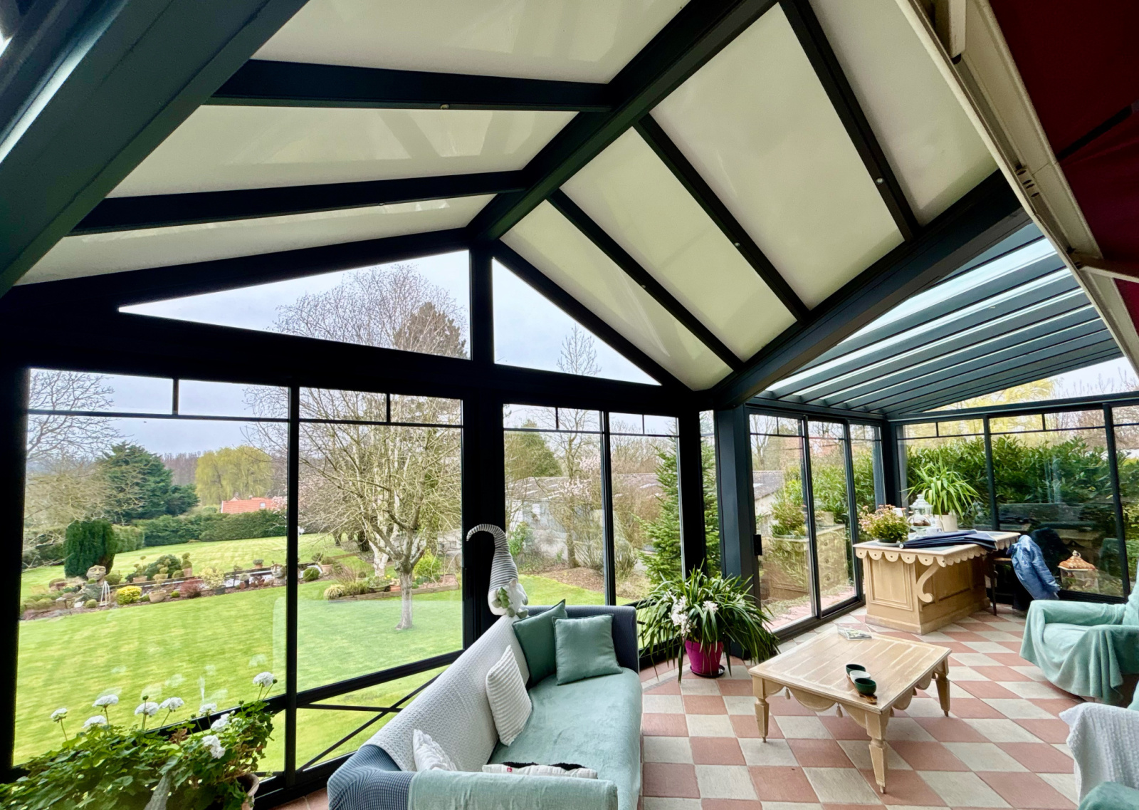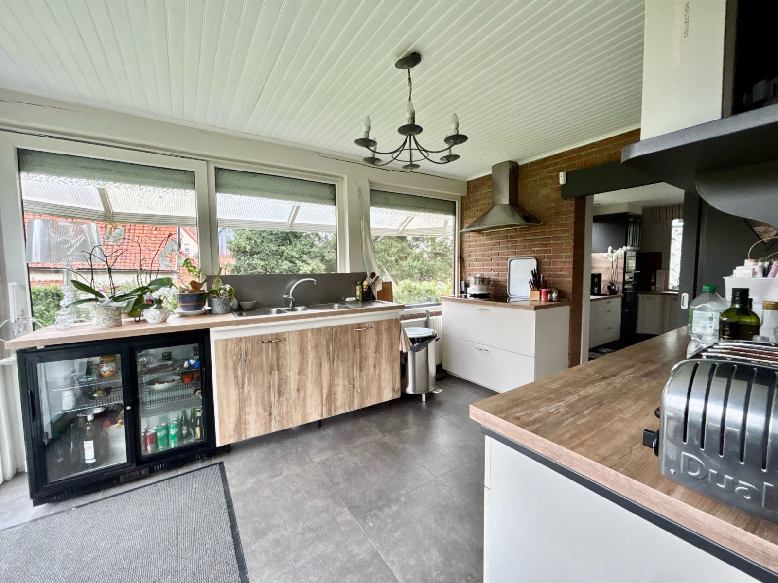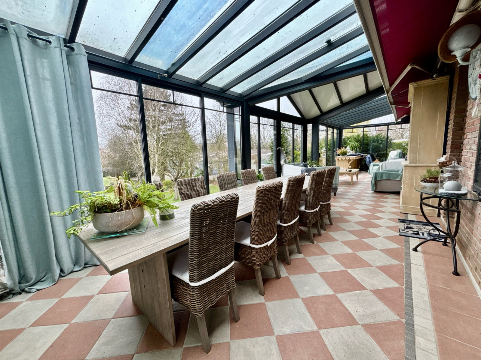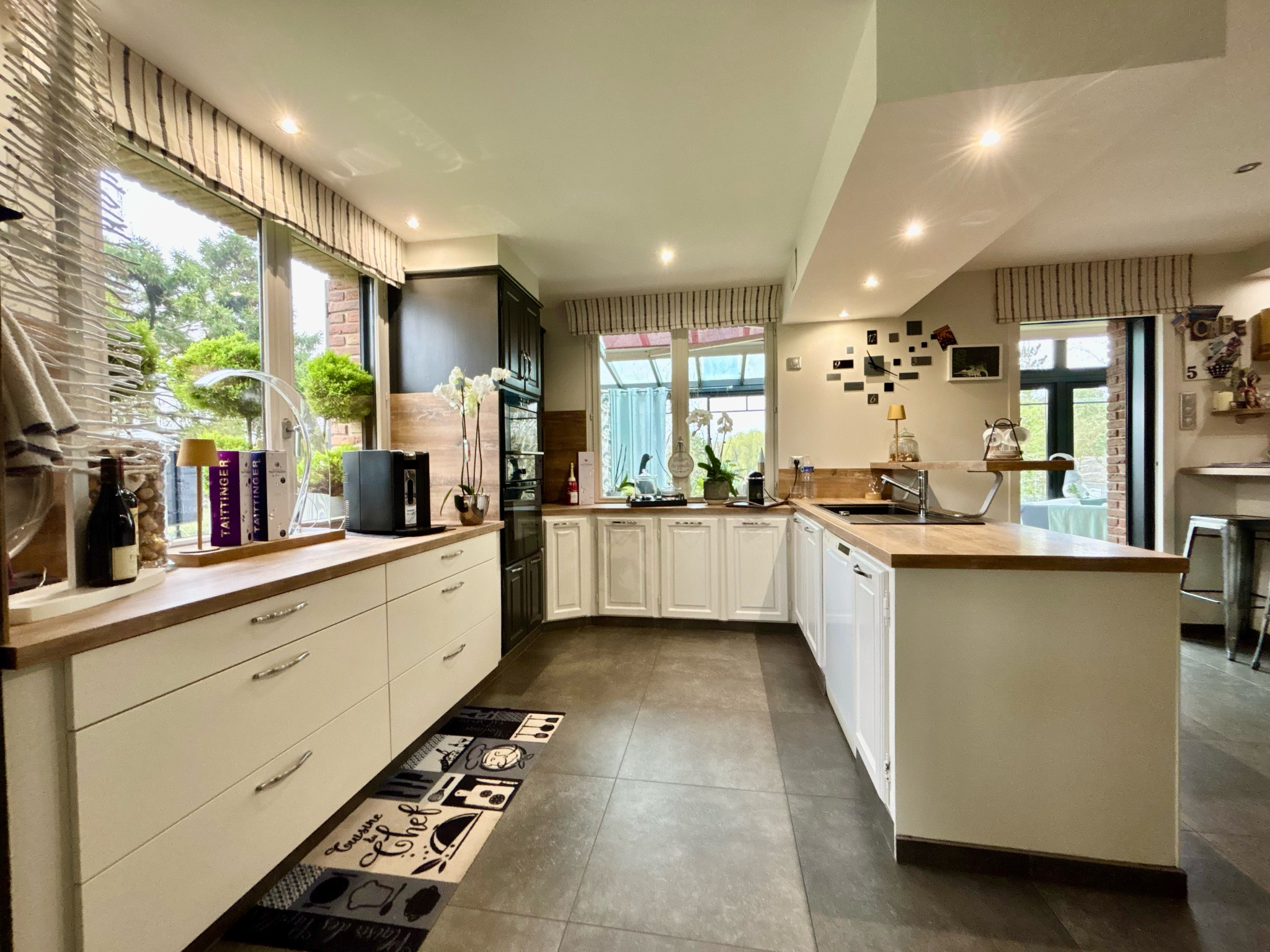 Hall d'entrée avec bureau et dressing, Salle de bains, toilette, 1 chambre avec cabine de douches PMR, salon avec cheminée insert, séjour de 44m² ouvert sur la cuisine équipée, deuxiéme cuisine, véranda de 44m² de la marque AKENA avec vue panoramique sur le jardin.