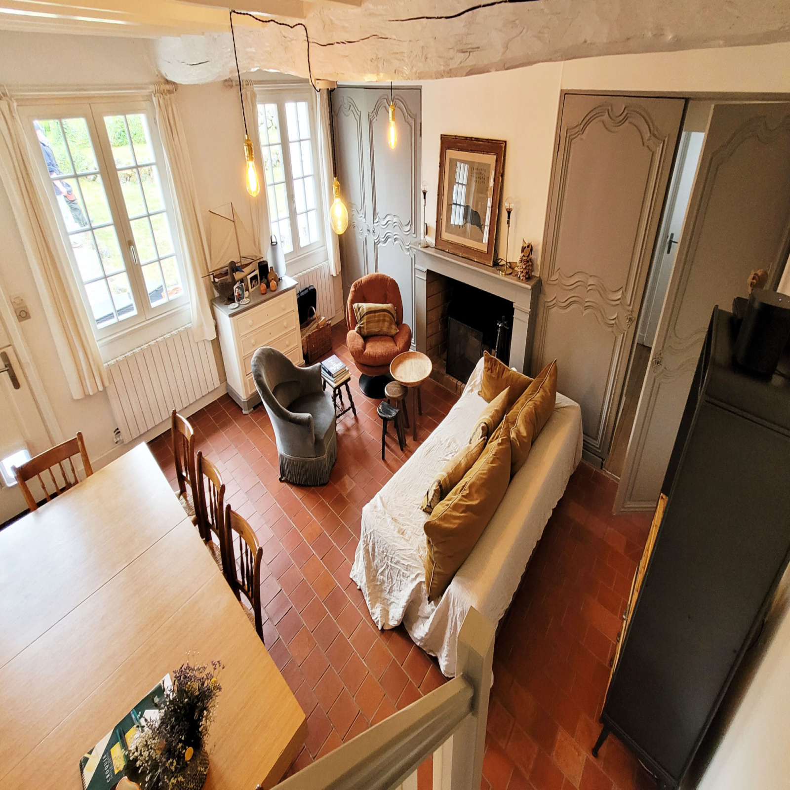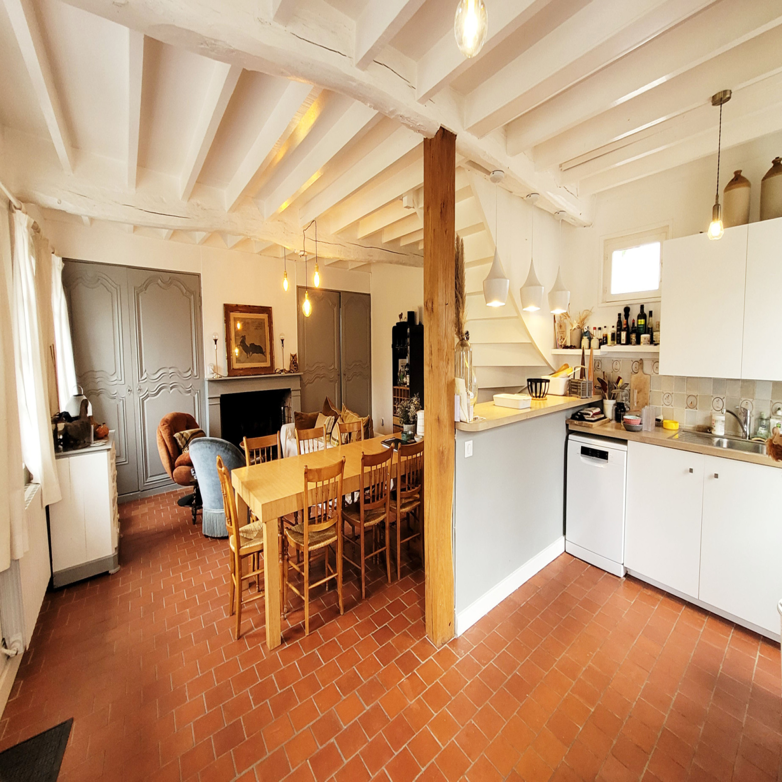 - séjour avec cuisine ouverte, avec deux accès extérieurs dont terrasse plein sud, cheminée bois à foyer ouvert dans le salon,